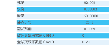 保賜利R-134a雪種料液來源ICI,系出名門,優(yōu)良的品質(zhì)會保證你放心的度過每一個(gè)炎熱的夏天,質(zhì)量指標(biāo)如下: