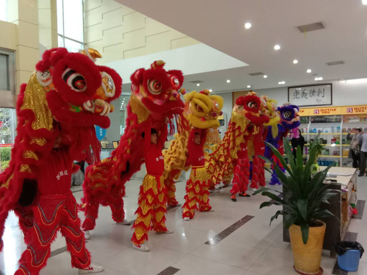 隨后,各彩色舞獅在鑼鼓聲中來到各辦公區(qū)域向各位員工拜年,