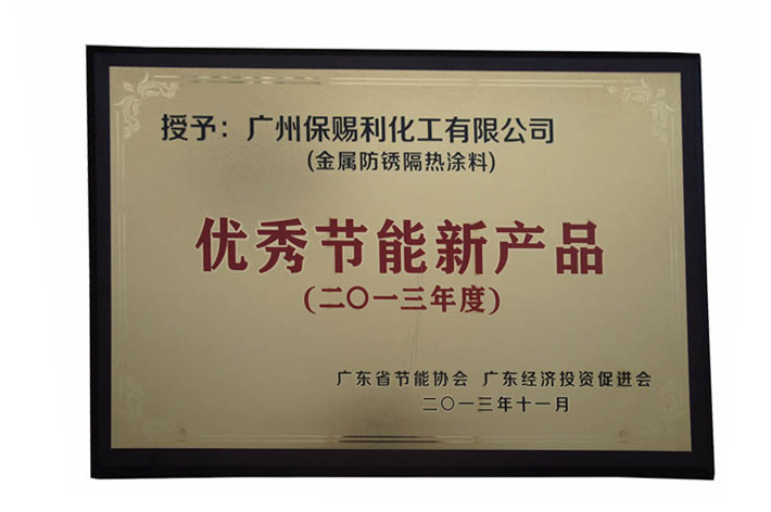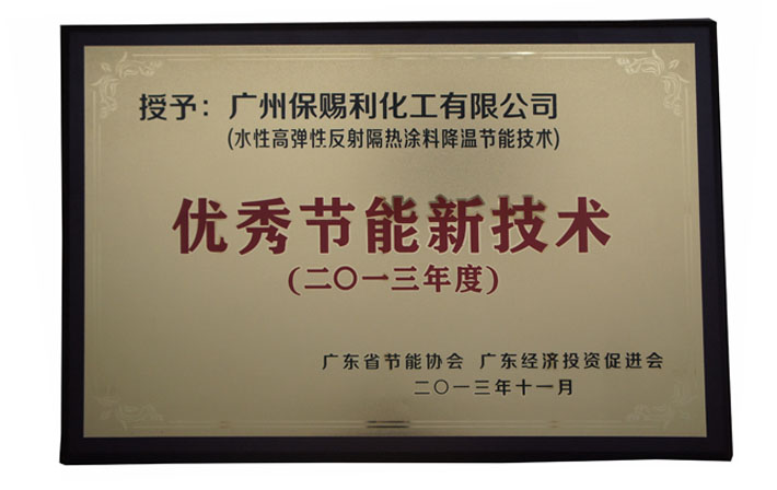由廣東省投資促進(jìn)會(huì)、廣東省節(jié)能協(xié)會(huì)組織《關(guān)于開展2013年度節(jié)能與投資、優(yōu)秀節(jié)能新技術(shù)和優(yōu)秀節(jié)能新產(chǎn)品的通知》的活動(dòng)中,經(jīng)單位自愿,本著公正、公平、公開的原則,在公示期間,聽取各界意見后,經(jīng)專家審核,最終,廣州保賜利化工有限公司憑借優(yōu)秀的隔熱節(jié)能產(chǎn)品和技術(shù),榮獲了“2013年度優(yōu)秀節(jié)能新產(chǎn)品——廣州保賜利化工有限公司(BOTNY金屬防銹隔熱涂料)”和 “2013年度優(yōu)秀節(jié)能新技術(shù)——廣州保賜利化工有限公司(BOTNY水性高彈性反射隔熱涂料降溫節(jié)能技術(shù))”,并頒發(fā)了榮譽(yù)牌匾,著標(biāo)志著廣州保賜利化工有限公司的建筑隔熱節(jié)能產(chǎn)品和技術(shù)獲得了廣泛的支持和認(rèn)可,是值得廣大消費(fèi)者、建設(shè)單位、設(shè)計(jì)單位和節(jié)能單位應(yīng)用,并能獲得很好的社會(huì)效益與經(jīng)濟(jì)效益的回報(bào)和增值。