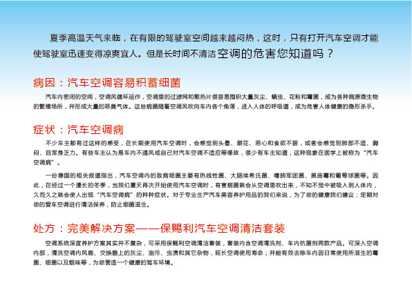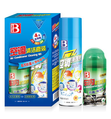 本套裝含空調(diào)清洗劑、車內(nèi)抗菌劑兩款產(chǎn)品。可深入空調(diào)內(nèi)部,清洗空調(diào)內(nèi)風(fēng)扇、交換器上的灰塵、油垢、蟲漬和其它雜物,延長空調(diào)使用壽命;并能有效去除車內(nèi)因日常使用所滋生的霉菌、細(xì)菌以及煙味等,為您營造一個健康的駕車環(huán)境