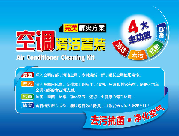 空調(diào)清洗劑:本品采用新一代技術(shù)及環(huán)保型原料精制而成,可深入空調(diào)內(nèi)部,清洗空調(diào)內(nèi)風(fēng)扇、交換器上的灰塵、油垢、蟲漬和其它雜物,并散發(fā)怡人的太陽花香味!能有效的保養(yǎng)空調(diào)、除臭,延長空調(diào)使用壽命,是免拆汽車空調(diào)內(nèi)部的專業(yè)清洗劑。