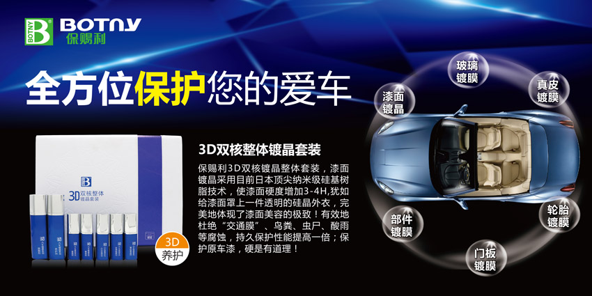 保賜利3D雙核鍍晶整體套裝,漆面鍍晶采用目前日本頂尖納米級(jí)硅基樹脂技術(shù),使漆面硬度增加3-4H,猶如給漆面罩上一件透明的硅晶外衣,完美地體現(xiàn)了漆面美容的極致!有效地杜絕“交通膜”、鳥糞、蟲尸、酸雨等腐蝕,持久保護(hù)性能提高一倍;保護(hù)原車漆,硬是有道理!
